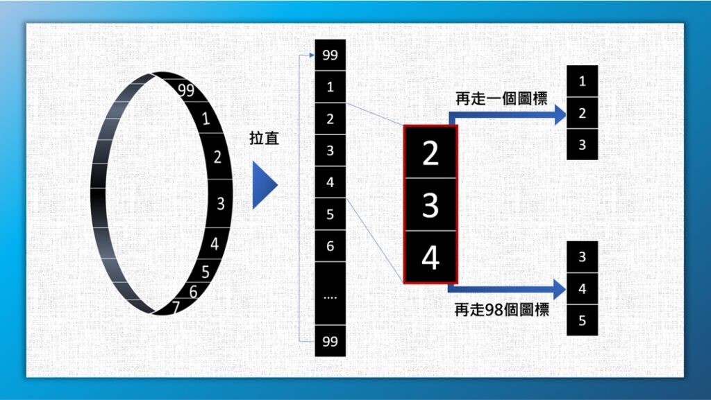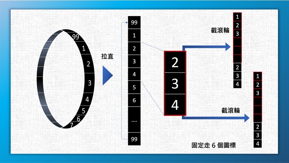 電子滾輪則用「截輪帶」技術 不論起點在哪,前後接上固定數量的「緩衝圖標」, 即可保持揭露節奏一致。